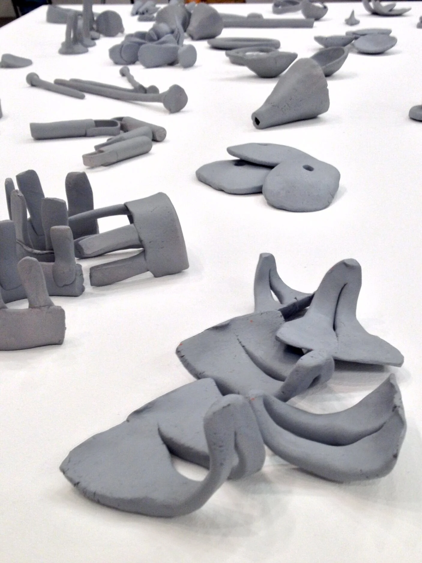 This collection of quickly rendered ceramic forms refers to the realm of the handheld—tools, toys, found objects—the things we carry with us from place to place. They are visual representations of a memory of an object, rather than the actual object itself. The arrangement emulates the process of sorting through personal objects when moving or culling and redistributing possessions after someone dies. For this installation at Santa Fe Clay, Brickell offered an assortment of small boxes for people to gather a collection of “Bones” to add to their personal collection of things.
